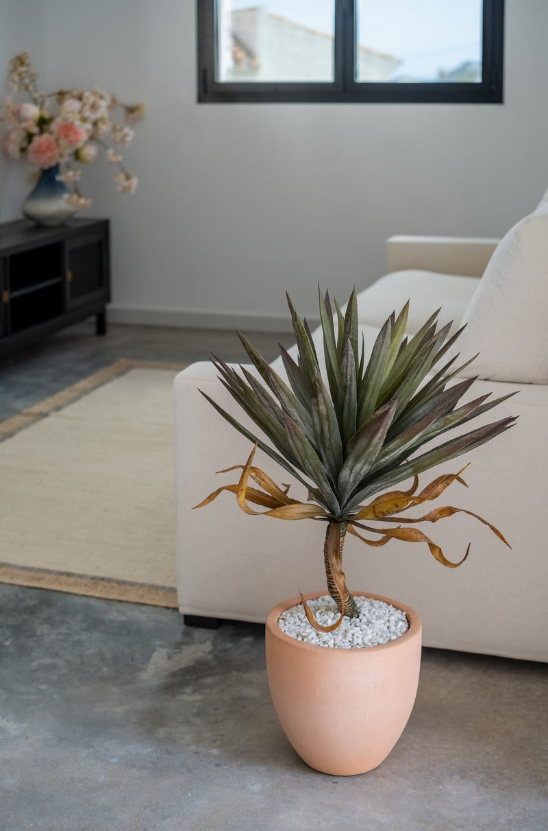 With its brownish leaves at the bottom, this plant looks almost real. It is an elegant smaller plant that blends into the décor and adds just the right touch.